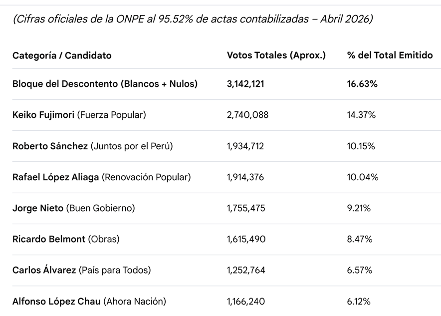 Con el conteo prácticamente culminado, la realidad demuestra que los peruanos eligieron el silencio y el rechazo a la institucionalidad democrática. Las cifras de la Oficina Nacional de Procesos Electorales (ONPE) revelan claramente que, de un total de 27.3 millones registrdos en el padrón electoral, el actor más importante de la elección es un bloque de 11.4 millones que no votó a nadie, representados por el ausentismo y los votos nulos y blancos. Estos representan el 42% del padrón electoral, y sus votos superan por más de cuatro veces a los que ha recibido la candidata más votada. La abstención es la primera fuerza electoral de una nación fragmentada que, en su hora más crítica, ha preferido el vacío antes que las opciones en la vitrina.
